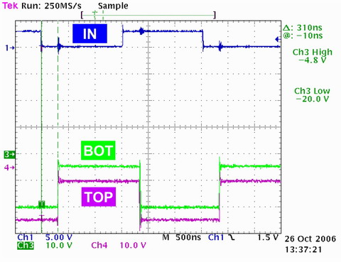 在TOP和BOT開關控制中采用雙極性電平轉換器這一先進概念,使得驅動器可以免受參考電壓變化的影響,只受電平轉換器開關阻斷能力的限制。在靜態電壓變化情況下,電平轉換器的功能由圖3a和圖3b中的信號特征來體現,電壓變化分別為+20V和-20V。動態電壓變化也很容易補償,如圖4a所示。此處,二次側驅動信號的特征幾乎是理想的,盡管在發射極電壓和驅動器參考電壓之間引入了噪聲信號。