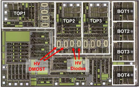 圖4b顯示的是SOI驅動器的布局,用以說明單獨通道。圖中也能看到用于TOP開關雙極性電平轉換器的高阻斷DMOS晶體管和二極管。