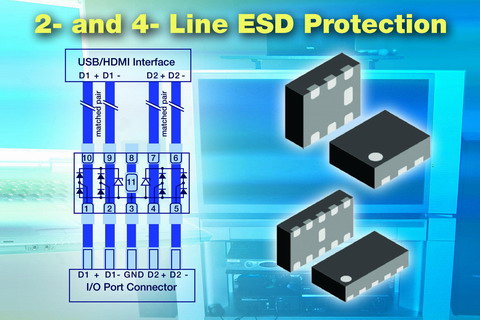 日前,Vishay Intertechnology, Inc.(NYSE 股市代號:VSH)推出兩款具有低電容及漏電流的最新小型ESD 保護陣列--- 2 線路的 VBUS052CD-FAH 和 4 線路的 VBUS054CD-FHI,這些器件可保護高速數據線,以防止瞬態電壓信號。