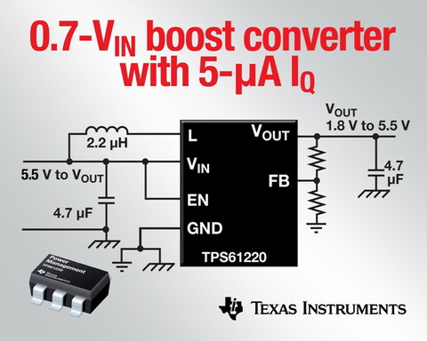 新型 TPS61220 升壓轉換器采用小型 SC-70 封裝,能以 0.7 V 的輸入電壓啟動到連接負載,從而確保便攜式系統的電池容量得到充分利用。基于滯后關閉控制技術,該器件采用同步整流,使在最低工作電流下的電源效率保持在85%以上。這使采用微處理器的應用(如使用 TI 新型 CC430 微控制器與片上低功耗 RF 的應用,更多詳情,敬請訪問:www.ti.com/cc430)可通過確保低功耗待機工作來延長電池使用壽命。
