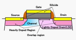 1. “低摻雜漏極”(LDD)區包圍該晶體管的漏極,并與門極重疊。這一結構既能降低水平擴展至漏極的電場,也能降低垂直擴展至門極氧氣層的電場,從而增加了擊穿電壓。