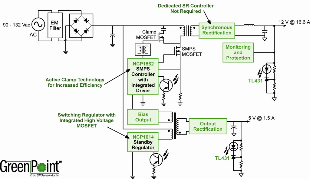 這個(gè)參考設(shè)計(jì)中的關(guān)鍵器件是NCP1562,為需要高能效和高功率密度電源而設(shè)計(jì)的有源鉗位脈寬調(diào)制(PWM, Pulse Width Modulation)電壓模式控制器。擁有極高精度(最多為±5%)的占空比限制,NCP1562讓設(shè)計(jì)工程師進(jìn)行MOSFET的優(yōu)化選擇,結(jié)合最佳能效和成本。這款器件的精度超越現(xiàn)有競(jìng)爭(zhēng)器件,它具有軟停止功能避免常見(jiàn)于正向有源鉗位拓?fù)浣Y(jié)構(gòu)振蕩,帶來(lái)更加安全且更強(qiáng)健的設(shè)計(jì)。為增強(qiáng)設(shè)計(jì)的安全性和可靠度,這器件具雙模式過(guò)電流保護(hù)電路,分別用來(lái)處理暫時(shí)和連續(xù)的過(guò)電流情況,這些集成的性能帶來(lái)了系統(tǒng)效能和安全性的最佳折衷,也縮減電源應(yīng)用的開發(fā)時(shí)間。