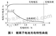 由此可見,鋰離子電池的安全性能和電池容量與溫度密切相關,當電池溫度升高時,電池內部將發生一系列化學反應,導致不可逆容量形成并產生大量熱量。如果電池內部反應產生的熱量遠遠大于電池散熱量,就會使電池溫度達到著火點,引起電池燃燒或爆炸。正是由于鋰離子電池的這些內部特性,使它的充放電速率都受到了限制,它無法像鎳鎘電池那樣,在短時間內急速充電,也無法大電流放電,否則,鋰離子電池的容量、壽命將會減少,甚至引發電池爆炸或燃燒。 兼顧充電過程的安全性、快速性和電池使用的高效性,鋰離子電池通常都采用恒流轉恒壓充電方式。充電初期,先用1 c恒定速率充電,電池電壓逐漸上升。當單體電池電壓上升到4.1 V(或4.2 V)時,充電器轉入恒壓充電方式,單體電池電壓波動控制在50 mV內,此時充電電流逐漸減小,當電流下降至某一設定值時,即可認為電池充電滿。圖1為鋰離子電池的充電特性曲線示意圖。為了保證鋰離子電池的放電容量,通常要求它的最大放電速率為1 c。