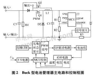 鋰離子電池具有體積小、重量輕、容量高、使用壽命長、無污染、無記憶效應等優點,在消費電子領域及其他場合得到了廣泛應用。采用電池管理器對鋰離子電池的充放電進行有效管理,可以延長電池的使用壽命。目前,鋰離子電池充電器方案主要有采用專用芯片控制構成和采用MCU(單片機)控制降壓型(Buck)變換器兩種方案。專用芯片控制方案構成簡單但功能單一,通常只能對特定參數的鋰離子電池進行充電。但是,不同型號的便攜式產品往往使用不同型號規格的鋰離子電池,如果采用專用芯片,就會造成重復開發和資源浪費。而采用單片機控制。Buck電路則精度高,成本低,而且控制方法靈活,可方便地進行改進和升級,從而適用于不同型號的鋰離子電池。