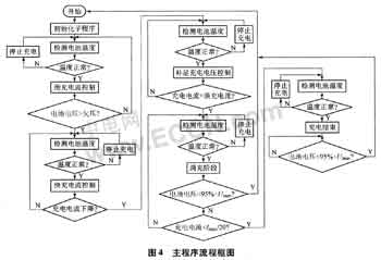 充電控制和狀態切換在主程序中實現,充電計時和狀態顯示在定時器中斷程序中實現。圖4為主程序流程框圖。