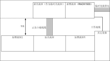 第三步:在原設備前1米位置臨時安裝1個新整流屏(RACK1500)和1個新直流屏(作為臨時直流屏),進行正負并接,并接上工作地線,用電纜(正負3根線纜)與老系統母線并機運行2小時,調高新整流屏(RACK1500)輸出電壓0.5V左右,使負載全部轉移到新整流屏RACK1500上運行12小時。如下圖(圖1):