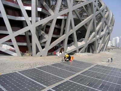 該工程首次采用的綠色能源—太陽能光伏并網(wǎng)發(fā)電系統(tǒng),總裝機(jī)容量為100千瓦,采用我公司最新研發(fā)的5KW并網(wǎng)逆變器,產(chǎn)品安裝在“鳥巢” 中包括主門在內(nèi)的七個(gè)進(jìn)出口門的入口處,其技術(shù)要求達(dá)到國(guó)際領(lǐng)先的水平。我公司與無錫尚德公司合作,通過激烈的竟?fàn)帲罱K以較高的性價(jià)比及擁有較多的成功業(yè)績(jī)而中標(biāo),并成為該系統(tǒng)的唯一供應(yīng)方,安裝運(yùn)行后,對(duì)“鳥巢”的電力供應(yīng)將起到良好的補(bǔ)充和示范作用。