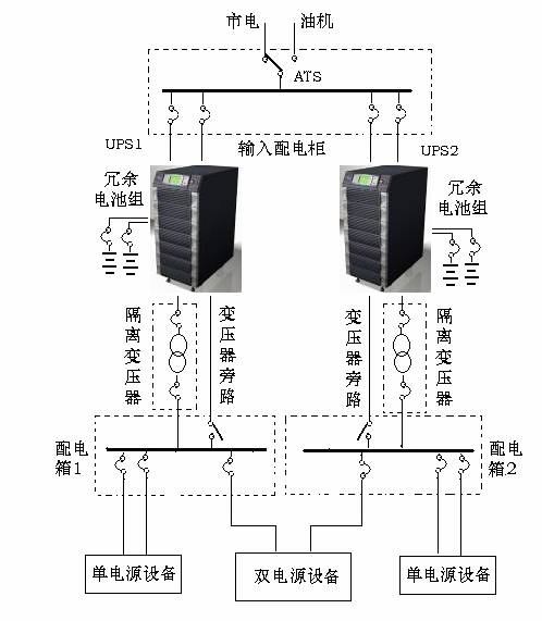 該方案采用一路市電,一路油機通過ATS轉換后給UPS供電。兩臺UPS的主輸入和旁路輸入都分別由輸入配電柜內的不同開關引入。主機采用臺達C系列模塊化UPS,可根據負載需要陸續擴容,始終保持各機單獨帶載時模塊還是N+1冗余的。每臺UPS至少配置兩組蓄電池,每組蓄電池都有自己的開關。UPS輸出側可根據零地電壓的高低決定是否增加隔離變壓器,如須增加隔離變壓器,則該變壓器采用H級絕緣等級的,并且配上旁路開關。兩臺UPS的輸出分別接到兩個配電箱內,雙電源設備直接從兩個配電箱內取電;單電源設備分別從UPS1或者UPS2的輸出配電箱內取電,實現正常情況下兩臺UPS的負載均分,單電源設備上游的配線和空開也采用冗余配置。