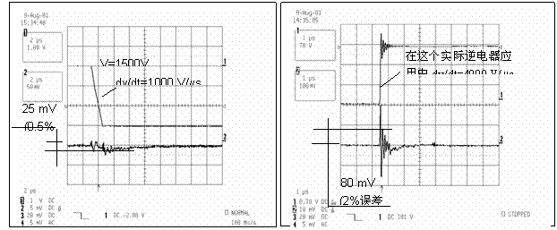 開關(guān)設(shè)備每次開關(guān)時產(chǎn)生的高dv/dt值將在主電纜和傳感器的電子電路之間產(chǎn)生電容電流。大多數(shù)模擬線性放大器對這種寄生電流很靈敏。因此,dv/dt噪聲將被疊加在輸出信號上。根據(jù)變動電壓的幅度和斜坡,初始尖峰和后來的振蕩有時會非常高,以致它們會激活傳感器的電流保護電路,進而使逆電器暫停運轉(zhuǎn)。LEM的經(jīng)驗在HX系列設(shè)計階段幫助保證了對關(guān)鍵噪聲的完美免疫力,而又不會損害帶寬,因此HX的性能要超過其它類似的傳感器(圖2和圖3)。