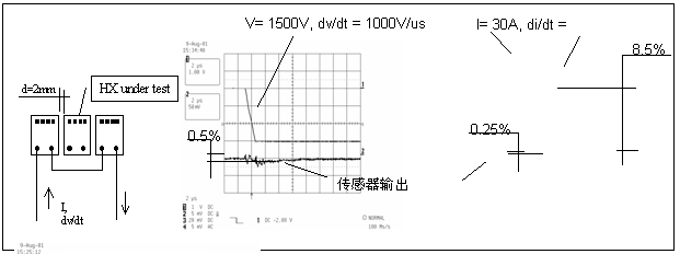 對階躍電流的超快速響應(yīng)時間對IGBT短路保護必不可少。HX系列可以以50A/ms以上的速度,準確追蹤電流變化,對階躍電流的響應(yīng)最快為3ms。