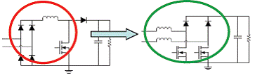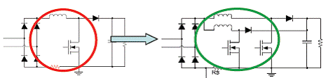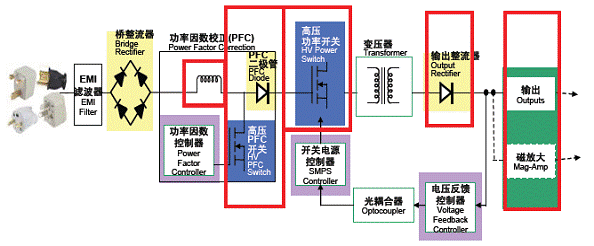 能效規范對電路段的挑戰主要體現在PFC能效、主轉換器能效和次級能效幾個方面。要提高這幾個方面的能效,就必須改善如圖1所示電路紅色框中的元件性能。以下將介紹改善電路段能效的幾種方法。