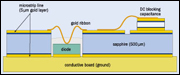 圖2. 單刀雙擲(SPDT)開關(guān)通過PIN二極管傳送RF信號到地面,二極管的電阻通過正直流信號控制。該原型的制作包括:用Al/Au微帶線在500μm藍寶石電介質(zhì)上形成耐高溫的微波混合集成電路(HIC),二極管上面的接觸用60μm厚的金絲連接到微波IC板上,它的背面通過熱壓輔助焊接到Ni/Au模板(接地);之后,耐高溫電介質(zhì)化合物注入PIN中,以防止它在高壓下被空氣電離;SPDT開關(guān)用來保護直流電壓帶來的信號,它的電容器被設計用來將工作溫度提升到300℃以上;感應器則用單金線制成,典型的SMA連接器通過熱壓輔助焊接到微帶上。