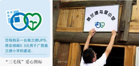 08年的5月和11月,一個叫“山特”的公司在這兩個地方分別建造了兩所小學,而這些建造費用,都源于山特公司08年開發出的一款叫“奧蘭德”的UPS機器(不間斷電源)的銷售提成。山特公司是國內UPS的龍頭,08年1月,山特員工在進行愛心慈善事業時的構想創立了奧蘭德品牌。Oriondo(奧蘭德)寓意“愛、保護和希望”,Oriondo(奧蘭德)UPS隨后面市,同時,公司啟動“三毛錢”愛心助學計劃。決定每銷售出一臺奧蘭德UPS,就將向助學基金捐款0.3元。并提出“愛心•保護”的公益理念,立志把“奧蘭德”的理念向薪火一樣傳遍每一處角落,讓更多窮困山區的孩子能夠上得起學。