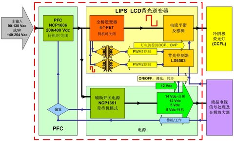 圖2:安森美半導(dǎo)體針對32英寸液晶電視的全橋高壓LIPS解決方案功能框圖。
