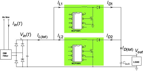 而在PFC方面,采用安森美半導(dǎo)體的NCP1606和NCP1654等PFC控制器,已經(jīng)可以將液晶電視厚度降到較低,而為了支持低至10 mm的極纖薄設(shè)計(jì),可以采用兩顆相對較小的NCP1601芯片,采用交錯(cuò)式架構(gòu)來予以實(shí)現(xiàn),如圖3所示。所謂交錯(cuò)式PFC,其主要想法是在原本放置單個(gè)較大PFC的地方并行放置兩個(gè)功率為一半的較小PFC。這兩個(gè)較小PFC以180°的相移交替工作,它們在輸入端或輸出端累加時(shí),每相電流紋波的主要部分將抵消。
