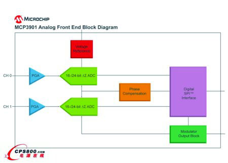 MCP3901 AFE具備雙16位/24位模數轉換器、集成參考電壓、可編程增益放大器和相位延遲補償