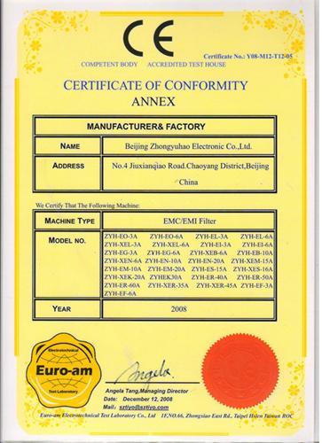 北京中宇豪電氣有限公司作為國內(nèi)著名的EMC/EMI電源濾波器、開關(guān)電源、電源模塊產(chǎn)品平臺(tái)廠商,第二批二十九種ZYH系列濾波器產(chǎn)品通過歐盟CE認(rèn)證。