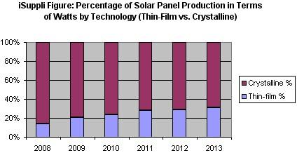 到2013年, 在全球太陽電池板市場上,薄膜的效率將從2008年的14%增加到31%。下圖所示為iSuppli公司對全球太陽能電池生產中薄膜和晶體技術所占比例的預測。