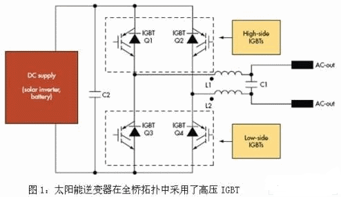 由于電源逆變器一般采用全橋拓撲,因此這個太陽能逆變器設計采用了4個高壓IGBT(圖1)。晶體管Q1和Q2用作高壓端IGBT,Q3和Q4用作低壓端功率器件。為保持低的總功率損耗低和高的電源轉換效率,這個DC/DC逆變器解決方案利用低壓端和高壓端IGBT產生頻率為60Hz的單相交流純正弦波形。