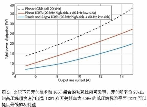 與快速和標準速度的平面器件相比,開關速度為20kHz的超快速溝道型IGBT可以提供最低的總導通損耗和開關功率損耗。同樣,對于低壓端開關電路,工作在60Hz的標準速度IGBT可以提供最低的功率損耗。