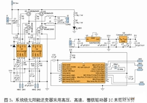 在系統級電源逆變器電路中,H橋的每條邊都使用高電壓、高速柵極驅動器IC進行驅動,并且這些IC具有獨立的低壓端和高壓端參考輸出通道(圖3)。驅動器IRS2106SPBF的浮動通道允許對高壓端功率晶體管進行自舉電源操作。