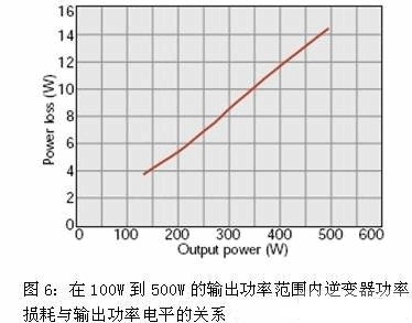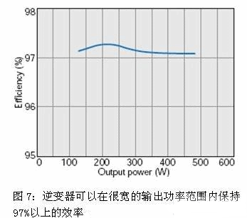 圖6給出了輸出功率電平從約100W到500W時測得的逆變器功率損耗。在相同輸出功率范圍、相同直流輸入下對逆變器效率的測量表明,它可在很寬的輸出功率范圍內保持好于97%的高輸出效率,即使功率損耗會隨著輸出功率變大而增加(圖7)。