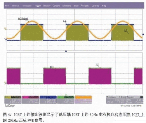 實質上,為保持諧波分量低和功率損耗最小,逆變器的高壓端IGBT采用脈寬調制(PWM),低壓端IGBT則以60Hz頻率變換電流方向。通過讓高壓端IGBT使用20kHz或20kHz以上的PWM頻率和50/60Hz調制方案,輸出電感L1和L2在實例中可以做得很小,并且照樣能對諧波分量進行高效濾波。此外,來自逆變器的可聞噪聲也很小,因為開關頻率高于人耳聽覺頻率。