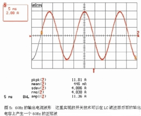 超快速二極管D1和D2提供向電容C2和C3充電的路徑,并且確保高壓端驅動器得到正確供電。在正輸出的半個周期內,高壓端IGBT Q1被正弦PWM調制,而低壓端Q4保持導通狀態(圖4)。同樣,在負輸出的半個周期內,高壓端Q2被正弦PWM調制,同時低壓端Q3保持導通。這種開關技術將在LC濾波器后面的輸出電容C4上產生一個60Hz的交流正弦波。