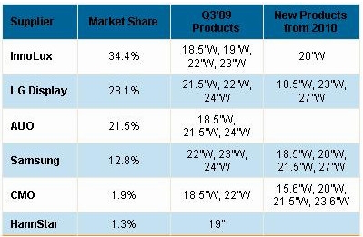 根據DisplaySearch最新一季關于LED背光源與背光模塊調查報告中指出,在2009年第三季,Innoulux是采用LED背光顯示器面板的領導廠商,出貨量市占率達34.4%(以下表一);而其它的面板廠商包含LG Display、AUO、Samsung與CMO也生產這類產品。而以品牌來看,像Samsung、Dell、LG、Acer、Lenovo、BenQ與AOC等在2009年第三季推出LED背光顯示器尺寸范圍包括了18.5”W到24”W。