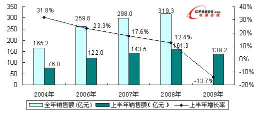 根據(jù)CSIA的初步統(tǒng)計,2009年上半年中國電源管理芯片銷售額為139.2億元,與2008年同期的161.3億元銷售額相比下滑13.7%,中國電源管理芯片市場首次出現(xiàn)大幅下滑,在經(jīng)歷2008年金融危機(jī)和行業(yè)不景氣的雙重影響之后,2009年上半年中國電源管理芯片市場遭受了更為直接的下游整機(jī)產(chǎn)品產(chǎn)量大幅下滑的打擊。