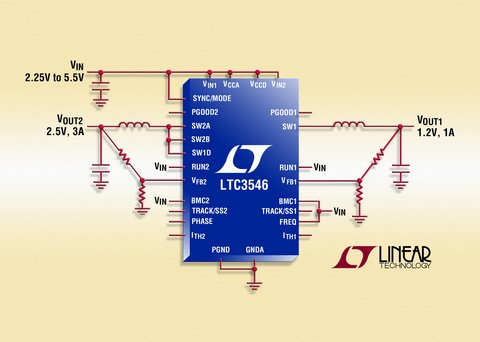 2009年2月12日-北京-凌力爾特公司(Linear Technology Corporation)推出雙通道、同步降壓型穩壓器LTC3546,該器件能以高達96%的效率提供兩路2A輸出或從一個通道提供3A、另一個通道提供1A輸出。LTC3546采用恒定頻率、電流模式架構,在2.25V至5V的輸入電壓范圍內工作,從而使它非常適用于單節鋰離子/聚合物或多節堿性/鎳鎘/鎳氫金屬電池應用。每路輸出都從0.6V至5V可調,并具有接通電源跟蹤。單獨的RUN和電源良好(Power Good)引腳實現對每個通道的獨立控制。LTC3546的開關頻率可以設置為2.25MHz或者從750kHz至4MHz可編程,從而使設計師能夠在避開關鍵噪聲敏感頻段時也可優化效率。其4mmx5mm QFN-28封裝與高開關頻率的結合允許使用小的外部電感器和電容器,從而提供一個占板面積非常緊湊和高熱效率的解決方案。