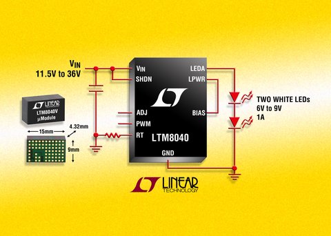 LTM8040可以將4V至36V的輸入電壓范圍轉換成更低的2.5V至13V電壓,適合于以不同的壓降(VD)驅動多種彩色和白光LED。該器件還具有模擬和真正彩色PWM(True Color PWM™)調光,允許400:1的恒定彩色調光范圍。LED電流幅度能用單個電阻線性地控制在0A至1A。缺省的開關頻率是500kHz,這可用一個電阻調節以實現直到2MHz運作。