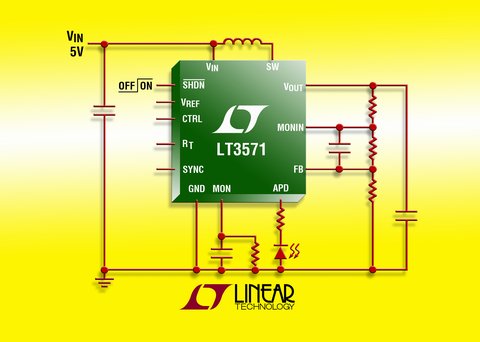 LT3571的內部75V、350mA開關提供高達75V的輸出電壓。其開關頻率可在250kHz至2mHz之間編程,從而使設計師能夠在最大限度地減小外部組件尺寸的同時優化效率。恒定頻率架構用來保持輸出紋波低于500uVPK-PK,這在大多數APD應用中都是至關重要的。為了進一步減輕對噪聲的擔憂,LT3571是可外部同步的。LT3571兼有一個傳統的電壓環路和一個獨特的電流環路設計,以作為恒定電流源或恒定電壓源工作,從而提供卓越的瞬態響應以及APD保護。該器件配備一個1.222V的內部基準和一個輔助基準輸入(通過CNTRL引腳),從而在該芯片正在工作的同時實現輸出電壓調節而沒有任何極性反轉。其它特點包括軟啟動、內部補償和熱停機。