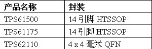 TPS61500、TPS61175與TPS62110現(xiàn)已開始批量生產(chǎn)。有關(guān)每款產(chǎn)品的封裝信息,敬請參見下表。
