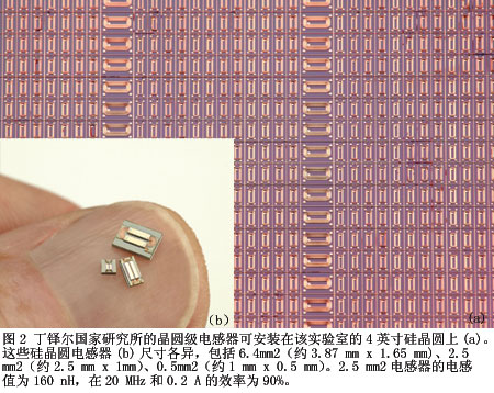 愛(ài)爾蘭考克大學(xué)的丁鐸爾國(guó)家研究所是最有經(jīng)驗(yàn)的晶圓級(jí)磁性元件研究中心之一,它利用其4英寸晶圓加工線來(lái)研究開(kāi)關(guān)頻率為10 MHz至100 MHz的電感器(圖2a)。這些電感器使用“跑道式”幾何結(jié)構(gòu)的電鍍銅繞組,后者被封裝在一種薄膜電鍍密封鎳鐵軟磁芯中(參考文獻(xiàn)2)。為了提供參考,丁鐸爾的研究人員用一塊單片MOSFET及驅(qū)動(dòng)器傳動(dòng)系IC演示了工作于15 MHz至65 MHz的電感器。這種降壓轉(zhuǎn)換器SMPS(開(kāi)關(guān)式電源)包含轉(zhuǎn)換器和電感器,在20 MHz時(shí)的效率為80%,使用了Coilcraft公司(www.coilcraft.com)的商用貼片電感器,并且輸入電壓為3V,輸出電壓為1.5V,輸出電流為100 mA。當(dāng)研究人員替換了Tyndall 2.5 mm2微電感器之后,效率降至76%。但請(qǐng)記住:Tyndall電感器不是為該電路設(shè)計(jì)的,它本是某種生產(chǎn)設(shè)計(jì)的一部分。Mathúna表示,研究人員可以調(diào)整銅損耗和磁芯損耗。他說(shuō):“我們把銅繞組電鍍到模具中,厚度為35 m至50 ?m。如果我們?cè)黾鱼~的厚度,我們就能在很大程度上仿真Coilcraft電感器。另外,磁芯材料有自己的內(nèi)在損耗。在鍍于薄膜的磁性材料中,電阻系數(shù)將會(huì)很低,即這些材料將會(huì)具有很強(qiáng)的導(dǎo)電能力。例如,某種鎳鐵材料的電阻系數(shù)約為45 Ωcm。如果我們改用另一種系數(shù)接近100 至150 Ωcm的磁性材料,我們就能降低渦流損耗。”