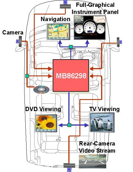 新型MB86298控制器在單一芯片上集成了下一代車載信息娛樂系統(tǒng)的必備功能,其所具有的高速視頻和圖像處理實現(xiàn)了業(yè)界首款能夠同時處理4個視頻輸入并把視頻輸出到4個顯示器的控制器。如先前所示,該款控制器不僅實現(xiàn)了同時向駕駛員提供導(dǎo)航圖像和在乘客座椅播放TV和視頻,而且能夠處理顯示3D圖形的組合儀表(包括儀表針)。此外,該控制器還能處理汽車上前后左右4部相機的輸入視頻,并對視頻進行實時綜合處理。針對汽車導(dǎo)航的3D繪圖,該控制器能在顯示器上輸出1600 × 600的高像素,可以帶來路況及周圍建筑和景色等豐富的圖像信息。
