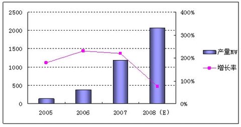 2008年受金融風暴的影響,全球經濟正在經歷一個困難的寒冬。近幾年保持高速增長的中國太陽能電池產業也感受到一絲寒意。盡管如此,2008年中國太陽能電池產業依舊受到業內廠商和投資者的青睞。2008年中國太陽能電池產量有望突破2000MW,相比2007年中國太陽能電池產業依舊保持較高的增長速度。