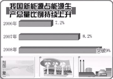 盡管2008年的最新統計數字尚未出爐,但是綜合各方面傳來的數據,特別是依托近10年來我國新能源生產及消費的增長速度等指標,我國新能源生產在總體能源結構中的比重會突破9%。