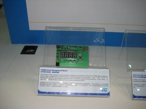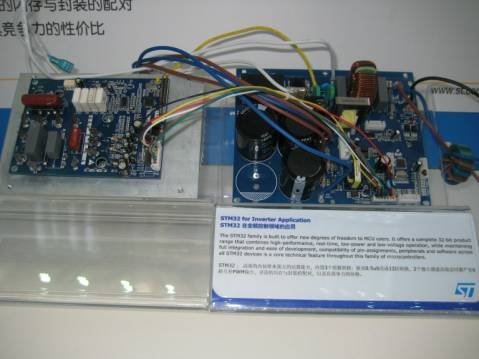 在節能控制器展區,最受關注的是基于STM32的變頻控制方案。近年來,由于人們對節能環保意識的不斷提高,使用變頻控制技術的節能家電不斷涌現。瞄準這一市場,各大MCU廠商紛紛推出相關產品。ST在2007年推出基于Cortex-M3的STM32系列產品,去年又擴展了STM32支持的電機矢量控制函數庫,新增了支持單旁路無傳感器控制、內部永磁(IPM)電機控制和永磁同步(PMSM)電機弱磁控制的算法。新增的控制函數功能被補充到STM32電機控制函數庫2.0版內,在新一代電器、工業驅動器、電泵、HVAC系統、POS機和電動汽機車等應用領域。據悉,目前市場上大約已有40種電機控制應用采用了STM32微控制器。