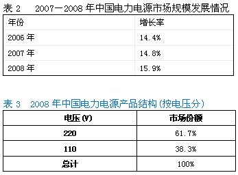 2008年中國電力電源市場總體銷售額同比增長了15.9%。電力電源市場與我國電力行業的發展有著密切的關系,而電力行業在我國宏觀經濟的拉動下,呈現出平穩較快的發展態勢。因此,電力電源市場近年來也出現了平穩增長的狀態。這期間,大、中、小發電站,變電所及工礦、石油、鐵路等直流用電企業仍然是電力電源市場銷售的主要對象,同時各個廠家都不斷完善自身的產品以及相應的服務措施。