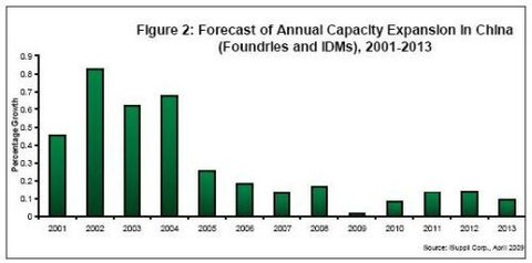 圖2所示為iSuppli公司對于2001-2013年中國半導體工廠產能的逐年預測,包括晶圓代工與集成設備制造商(IDM)在內。