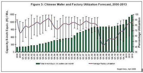 圖3所示為iSuppli公司對于2000-2013年中國晶圓與工廠產能利用率的預測。