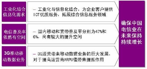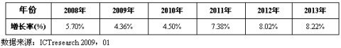 截至2008年10月份,中國的電信業務收入達到6797.9億元,同比增長8.1%,增長勢頭依然良好。ICTresearch認為,中國電信業未來三年有望繼續增長,主要基于以下三方面的原因:①全業務經營為運營商在兩化融合方面拓展帶來了新的發展機遇;②中國的寬帶和移動電話普及率依然有較大的提升空間;③國內3G建設將進一步增加運營商的數據業務收入。