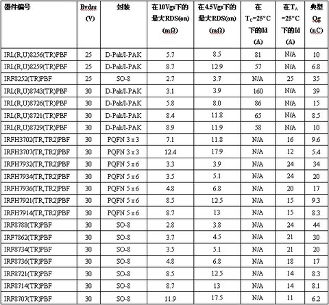 新MOSFET系列采用了IR經過驗證的硅技術,可提供基準通態電阻(RDS(on)),并且提高了轉換性能。新器件的低傳導損耗改善了滿載效率及熱性能,即使在輕負載條件下,低轉換損耗也有助于實現高效率。