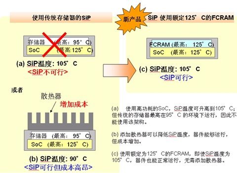 如圖1所示,迄今為止,使用傳統(tǒng)的存儲(chǔ)器,SiP發(fā)揮受限,而使用新型FCRAM產(chǎn)品就可以解決這一問題。圖1(a)介紹的SiP架構(gòu)上使用的高性能SoC功耗較高,產(chǎn)生的熱量可使SiP溫度上升到105℃。因?yàn)镾oC的最高溫度額定為125℃,所以操作能夠正常進(jìn)行,但使用傳統(tǒng)的存儲(chǔ)器僅可在最高為95℃的溫度環(huán)境下運(yùn)行,因此不能使用這一SiP架構(gòu)。