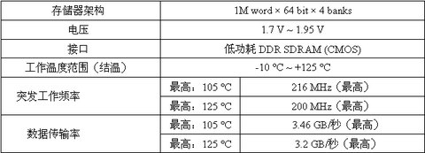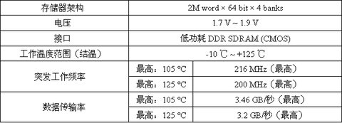 工作溫度是125℃時(shí),新型FCRAM通過使用64bit總線寬并在最高工作頻率為200MHz運(yùn)行時(shí),可以提供3.2 GB/秒的數(shù)據(jù)傳輸率,這是傳統(tǒng)的DDR2 SDRAM速度的兩倍。若工作溫度不高于105℃(≤ 105℃),在216 MHz的工作頻率下運(yùn)行時(shí),產(chǎn)品的數(shù)據(jù)傳輸率將增加到3.46 GB/秒。