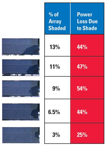 如上所述,在光伏系統中,太陽能電池板是由多個串聯組并聯后形成的。就像節日燈飾一樣,假如串聯中的任何某個電池發生故障,就會導致整個電池組失效。此外,當有局部陰影或碎礫等遮蔽光伏系統時,這種情況也會發生。