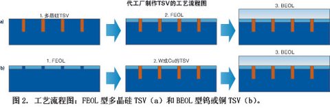 TSV可以在IC制造過程中制作(先制作通孔,viafirst),也可以在IC制造完成之后制作(后制作通孔,vialast)。在前一種情況下,前道互連(FEOL)型TSV是在IC布線工藝開始之前制作的,而后道互連(BEOL)型TSV則是在金屬布線工藝過程中在IC制造廠中實現的。