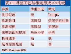 對于激光技術的重大進展,三星(韓國,首爾)已經在存儲器疊層中采用了這一技術。大多數最新數據都來自于Xsil(愛爾蘭,都柏林)的AlexeyRodin及其同事。作為一種不需掩膜的工藝,激光加工避免了光刻膠涂布、光刻曝光、顯影和去膠等工藝步驟。然而,未來當TSV尺寸降到10μm以下時,激光鉆孔是否可以進一步縮小,目前來看還存在一些問題。