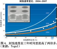 目前“鉆蝕”TSV的技術主要有兩種,一種是干法刻蝕或稱博世刻蝕,另一種是激光燒蝕(表1)。博世工藝十多年為MEMS工業而開發,快速地在去除硅的SF6等離子刻蝕和實現側壁鈍化的C4F8等離子沉積步驟之間循環切換。通過圖4可以看出,在過去幾年里,刻蝕速度穩步提高。